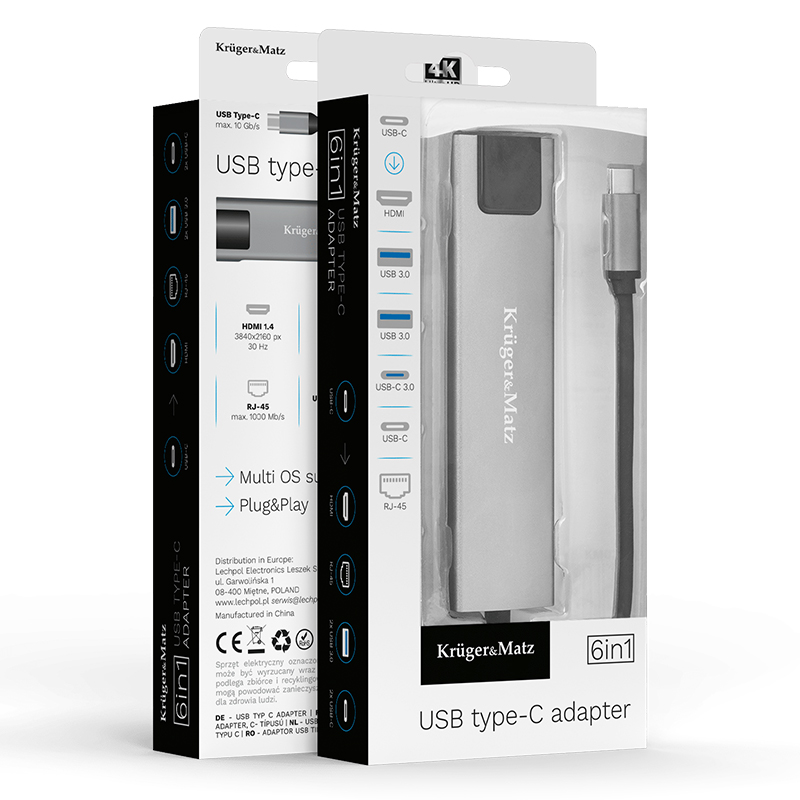 (KM0391.2) ADAPTOR HUB USB TIP C HDMI/2X USB3.0/2X USB TIP C/RJ45