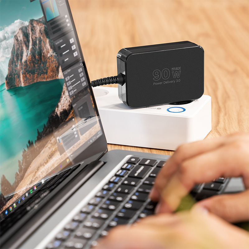 Portul USB-C cu tehnologie Power Delivery iti permite sa incarci nu doar laptopuri, ci si smartphone-uri, tablete si alte accesorii electronice. Datorita puterii de iesire de 90 W si ajustarii inteligente a parametrilor, incarcarea este rapida si sigura. Aceasta solutie moderna combina functionalitatea mai multor incarcatoare intr-un singur dispozitiv compact.