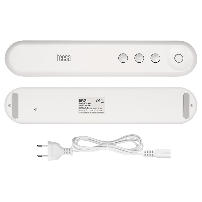 Aparatul de ambalat in vid Teesa V100 este un dispozitiv care impresioneaza nu doar prin functionalitatea sa, ci si prin aspectul sau. Datorita dimensiunilor compacte si greutatii reduse, dispozitivul se va integra cu usurinta in orice bucatarie. Carcasa alba cu butoane cu iluminare din spate albastra ii confera un caracter modern și elegant.