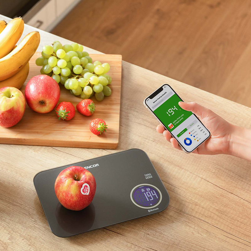 Cântarul este echipat cu tehnologie wireless Bluetooth, care, împreună cu aplicația gratuită Sencor FOOD instalată pe dispozitivul inteligent, oferă acces direct la o bază de date extinsă și actualizată periodic cu ingrediente și valorile lor nutriționale.