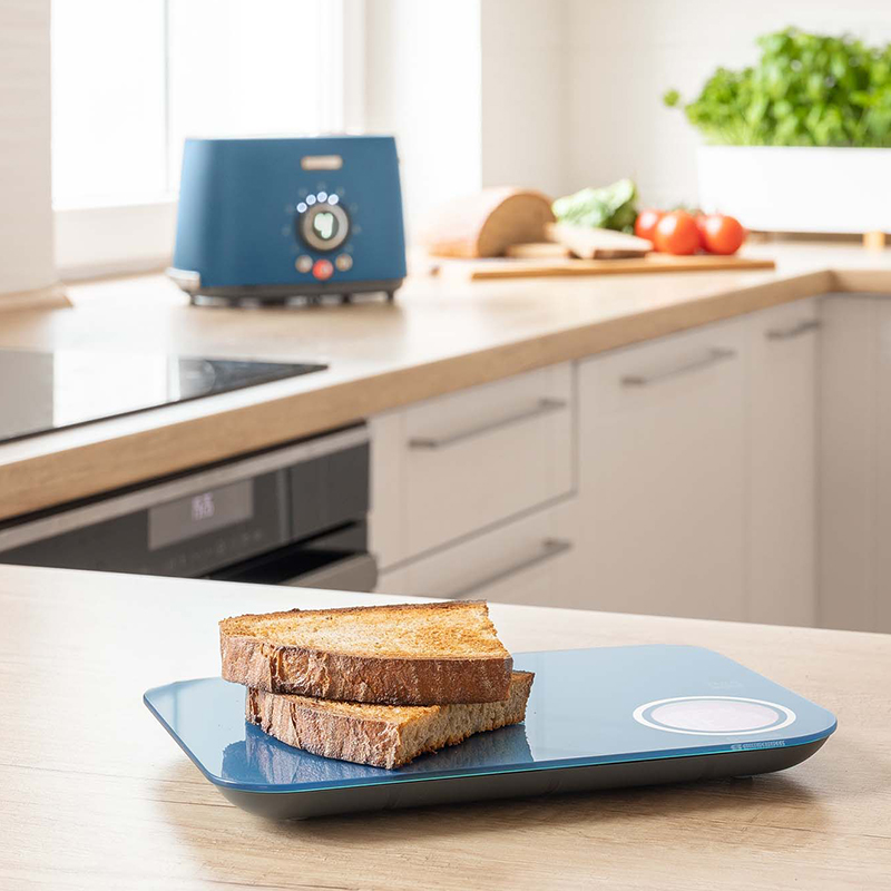 Conectarea cântarului cu telefonul mobil prin Bluetooth este incredibil de rapidă, intuitivă și ușoară. Practic imediat, veți vedea pe ecranul smartphone-ului (și nu contează dacă preferați un dispozitiv Android sau iOS) greutatea măsurată, apoi pur și simplu introduceți produsul pe care îl cântăriți pentru a vedea instantaneu cât zahăr, grăsime, energie etc. conține alimentul respectiv.