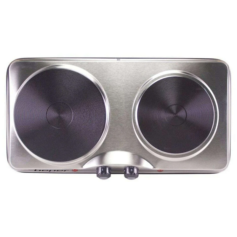 Plită electrică cu corp din oțel și 2 plăci din fontă cu diametrul de 18,5 cm și 15,5 cm. Echipată cu termostat dublu pentru reglarea celor 5 niveluri de temperatură ale celor două plăci diferite. Lumină de avertizare. Protecție împotriva supraîncălzirii și picioare antiderapante pentru a asigura stabilitatea.