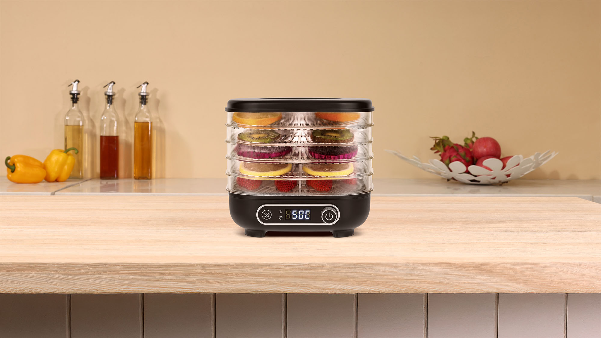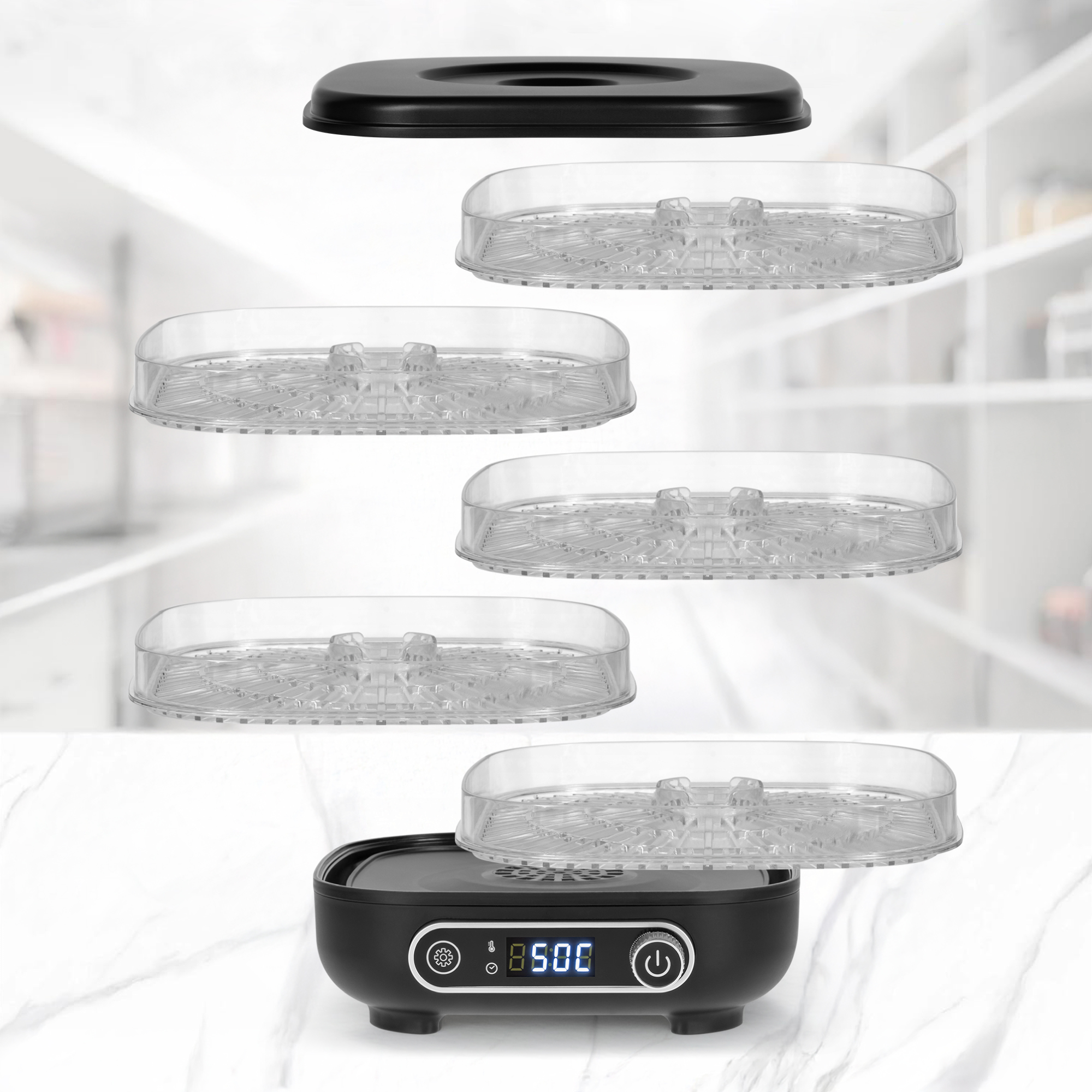 Deshidratorul de alimente Teesa ofera pana la 5 niveluri de uscare, ceea ce iti permite sa prepari mai multe produse in acelasi timp. Sitele transparente iti dau posibilitatea sa vizualizezi procesul fara a intrerupe lucrul, ceea ce iti permite sa mentii o temperatura constanta si sa economisesti energie.