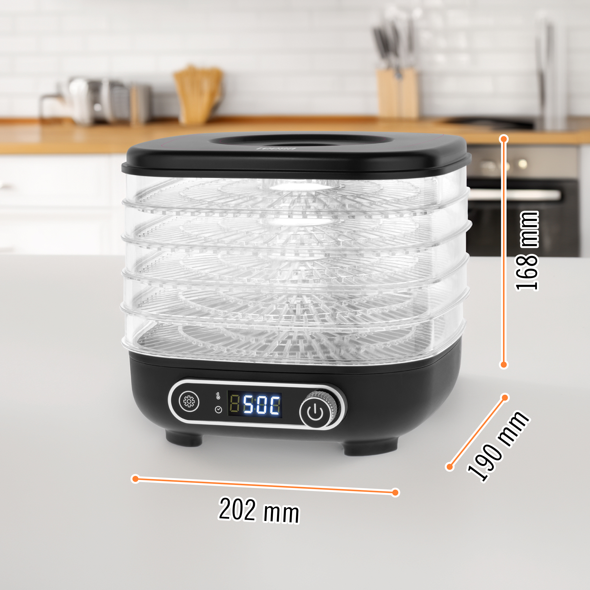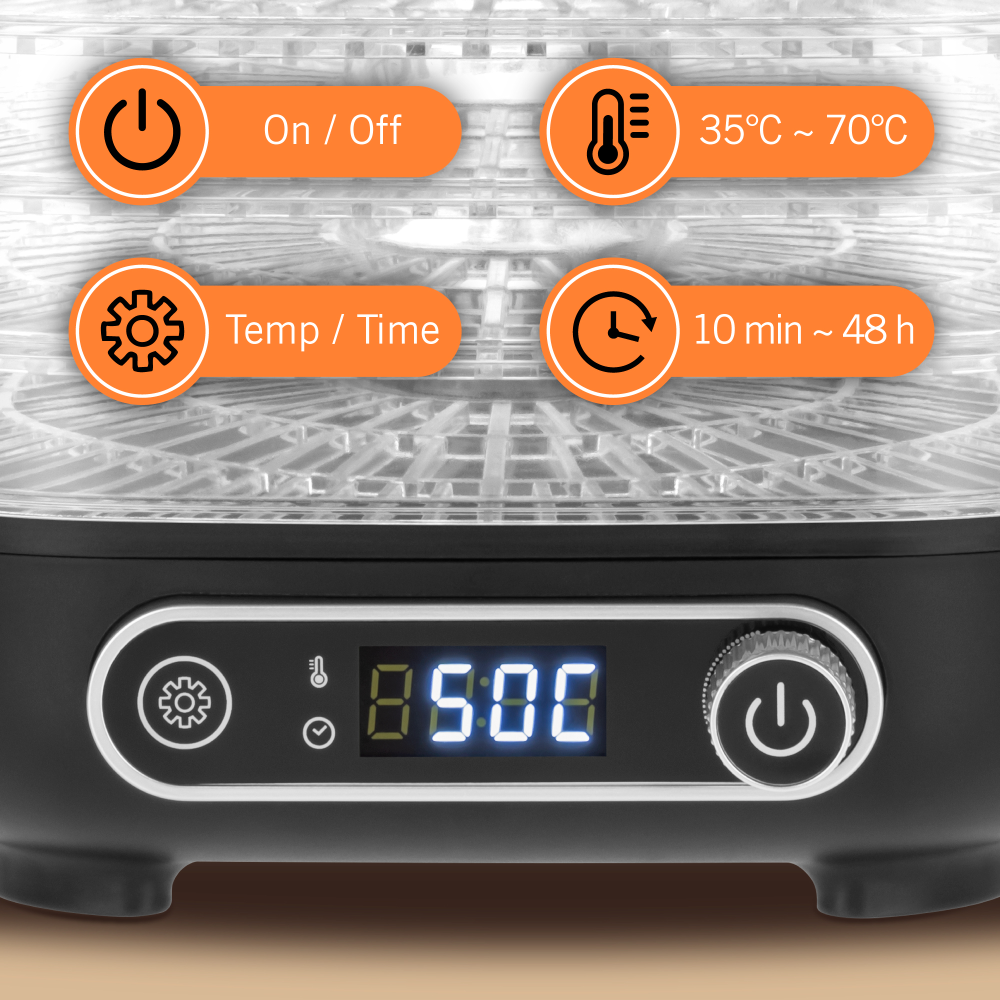 Panoul de control modern si intuitiv, cu afisaj LCD, iti permite sa setezi cu precizie timpul de uscare de pana la 48 de ore. Astfel vei putea ajusta procesul la nevoile individuale si asigura confortul in utilizare, datorita caruia deshidratorul functioneaza exact atat timp cat ai nevoie.