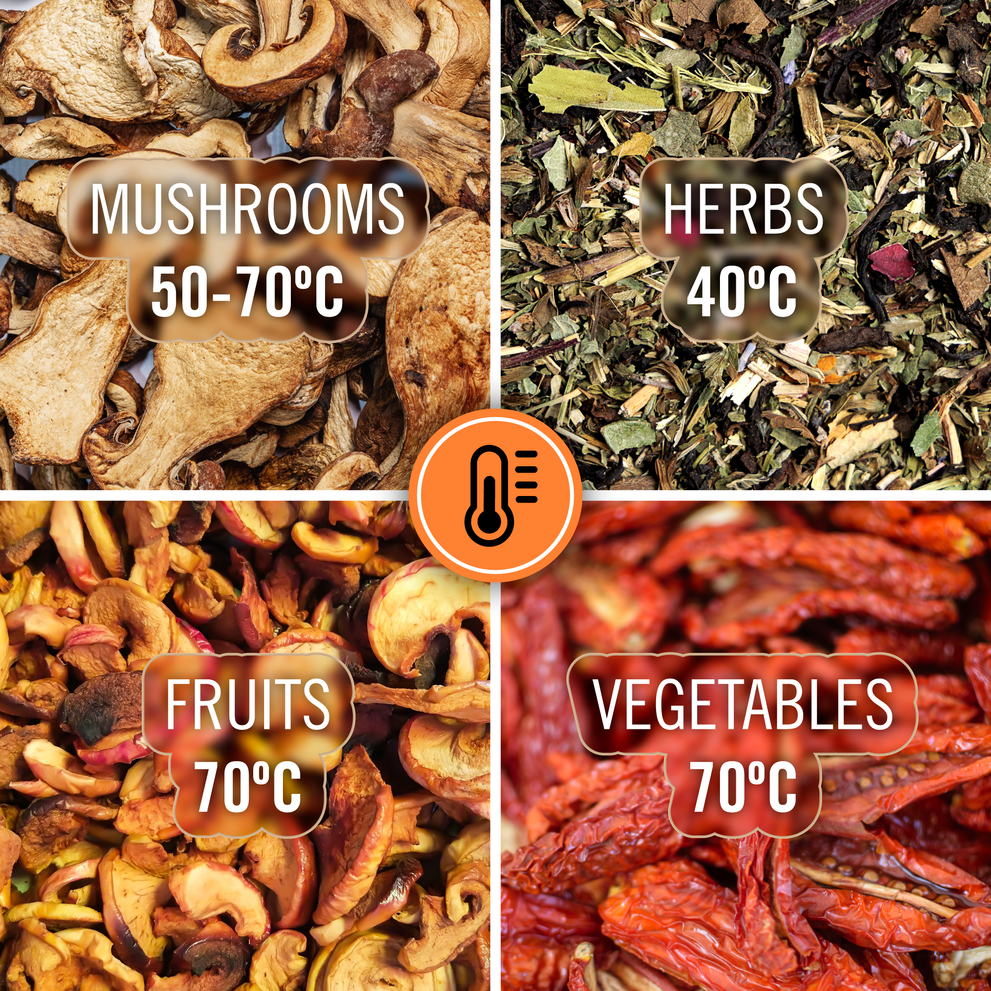 Datorita intervalului larg de temperatura (35-70°C), poti adapta perfect setarile la tipul de produs care urmeaza sa fie uscat - ierburi aromatice delicate, fructe carnoase sau legume aromate. Acest lucru garanteaza o deshodratare optima fara riscul de a pierde nutrienti valorosi.