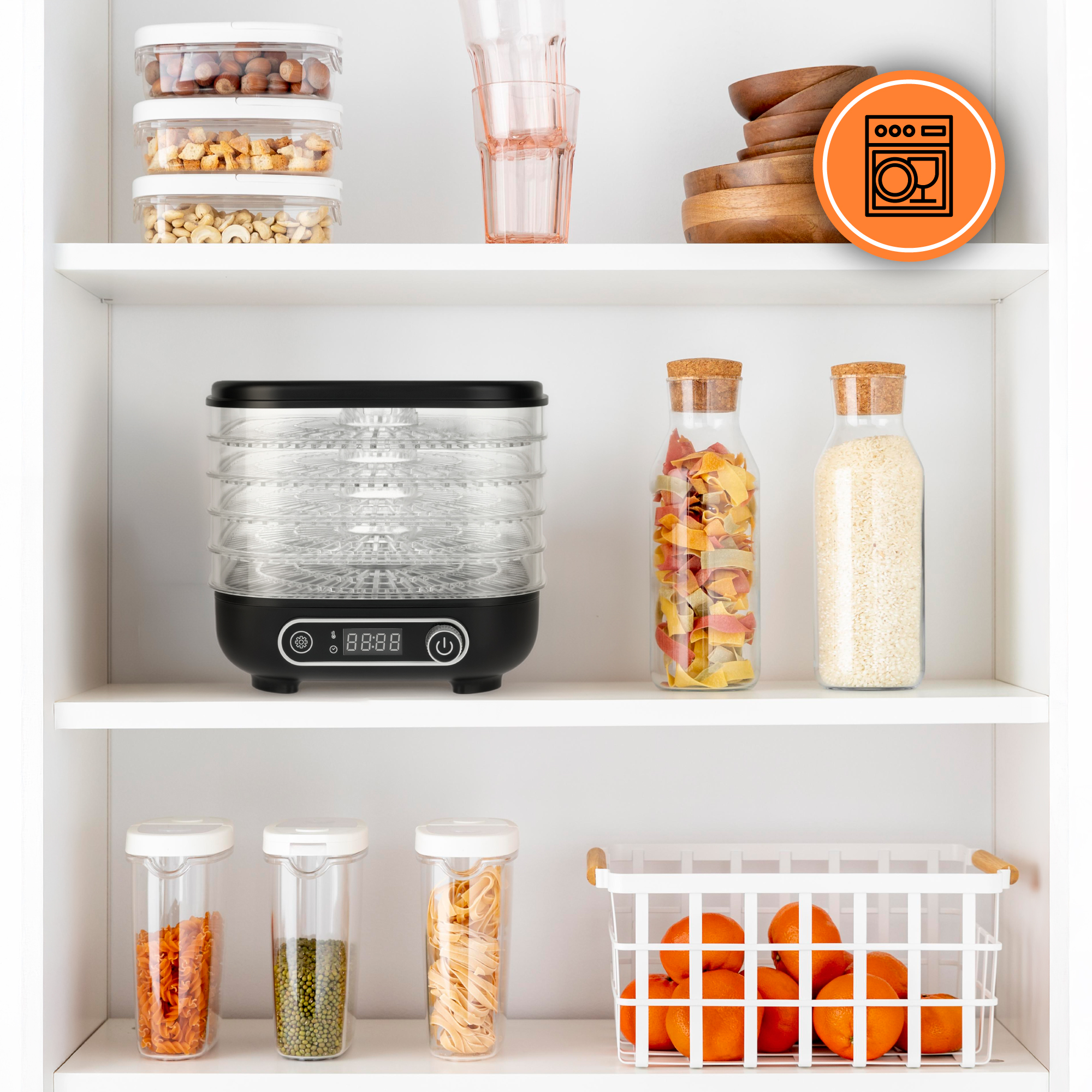 Deshidratatorul Teesa a fost conceput avand in vedere usurinta maxima in utilizare. Sitele transparente pot fi spalate in masina de spalat vase, ceea ce le face mult mai usor de curatat. In plus, dimensiunile sale compacte il fac usor de integrat in orice bucatarie - usor de depozitat intr-un dulap, dar intotdeauna la indemana.