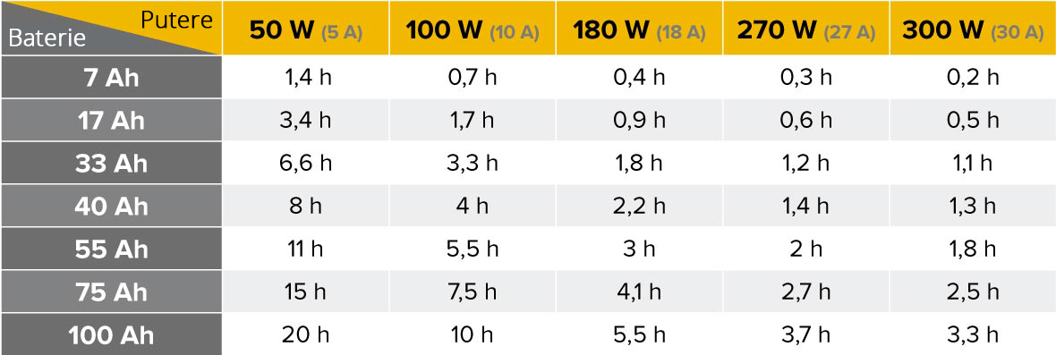 Pentru a asigura functionarea optima a UPS-urilor KEMOT, trebuie aleas un acumulator extern potrivit. Alegerea acumulatorului potrivit se poate face dupa formula aproximativa: la sarcina de 100 W = 10 A consumati din acumulator.
