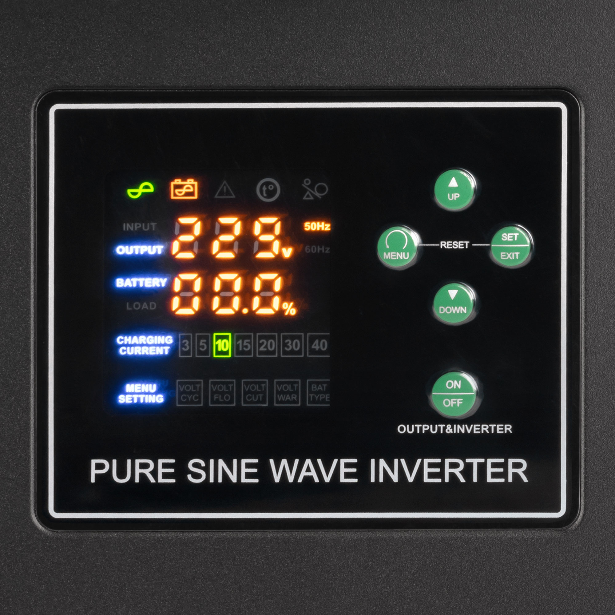 UPS-urile PRO Sinus de la KEMOT sunt echipate cu un afisaj LED clar care arata starea curenta de functionare a dispozitivului. Pe ecran puteti verifica, printre altele tensiunea de intrare, tensiunea de iesire si frecventa. Mai mult, puteti verifica rapid nivelul de incarcare la iesirea UPS-ului si nivelul de incarcare a bateriei.