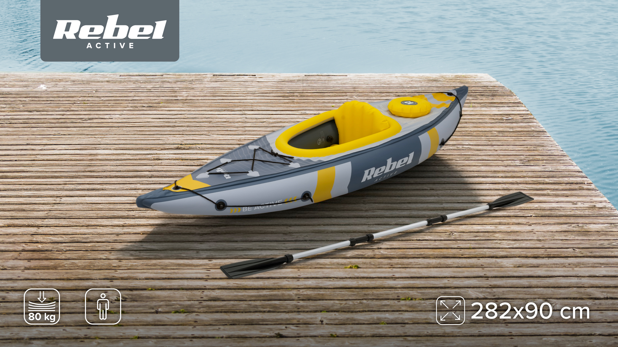 Caiacul Rebel Active ofera tot ce ai nevoie pentru a iesi pe apa imediat dupa desfacere. Setul include o pompa de picior, o vasla reglabila, un scaun gonflabil cu spatar si un suport pentru picioare detasabil. Totul se potriveste intr-un pachet usor - perfect pentru cei care apreciaza mobilitatea si instalarea rapida.