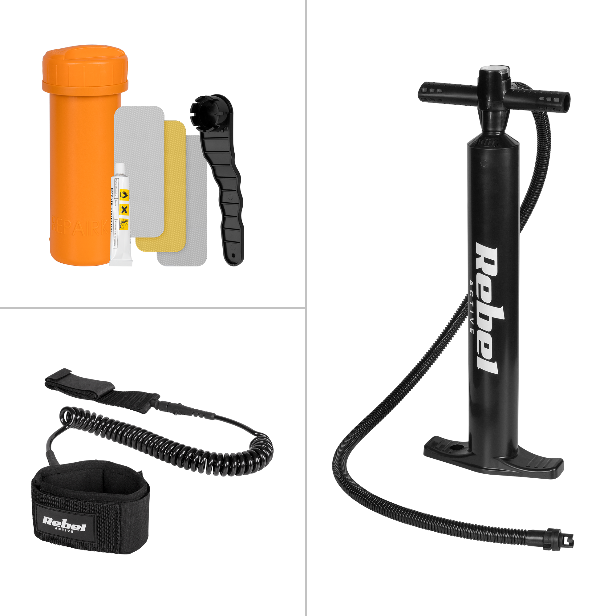 Placa de SUP RBA-4512 vine cu o pompa manuala cu manometru pentru o umflare rapida si eficienta. In plus, placa vine cu un kit de reparatii format dintr-o cheie pentru valva, trei petice de reparatii si lipici, astfel incat sa poti remedia rapid orice problema si sa te poti intoarce la vaslit!