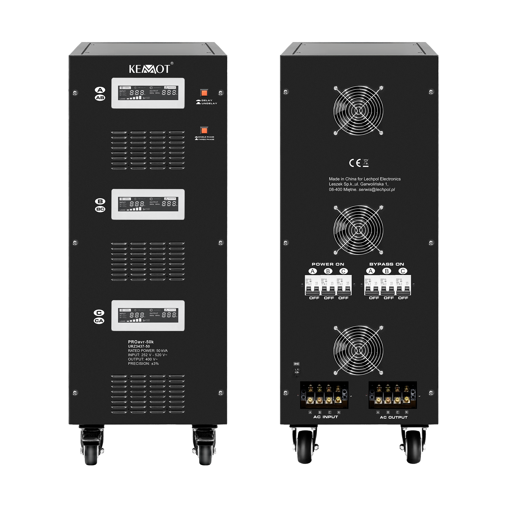 In modul monofazat, fiecare faza poate functiona independent una de cealalta. Indiferent de sarcina retelei si fluctuatiile tensiunii de iesire, stabilizatorul KEMOT PROavr-50k le mentine la 230 V ±3%, permitand functionarea eficienta a tuturor dispozitivelor, inclusiv a celor sensibile la calitatea tensiunii retelei. Reglarea este automata, asigurand o precizie ridicata a tensiunii de iesire. O eroare in functionarea uneia dintre faze nu afecteaza functionarea celorlalte.