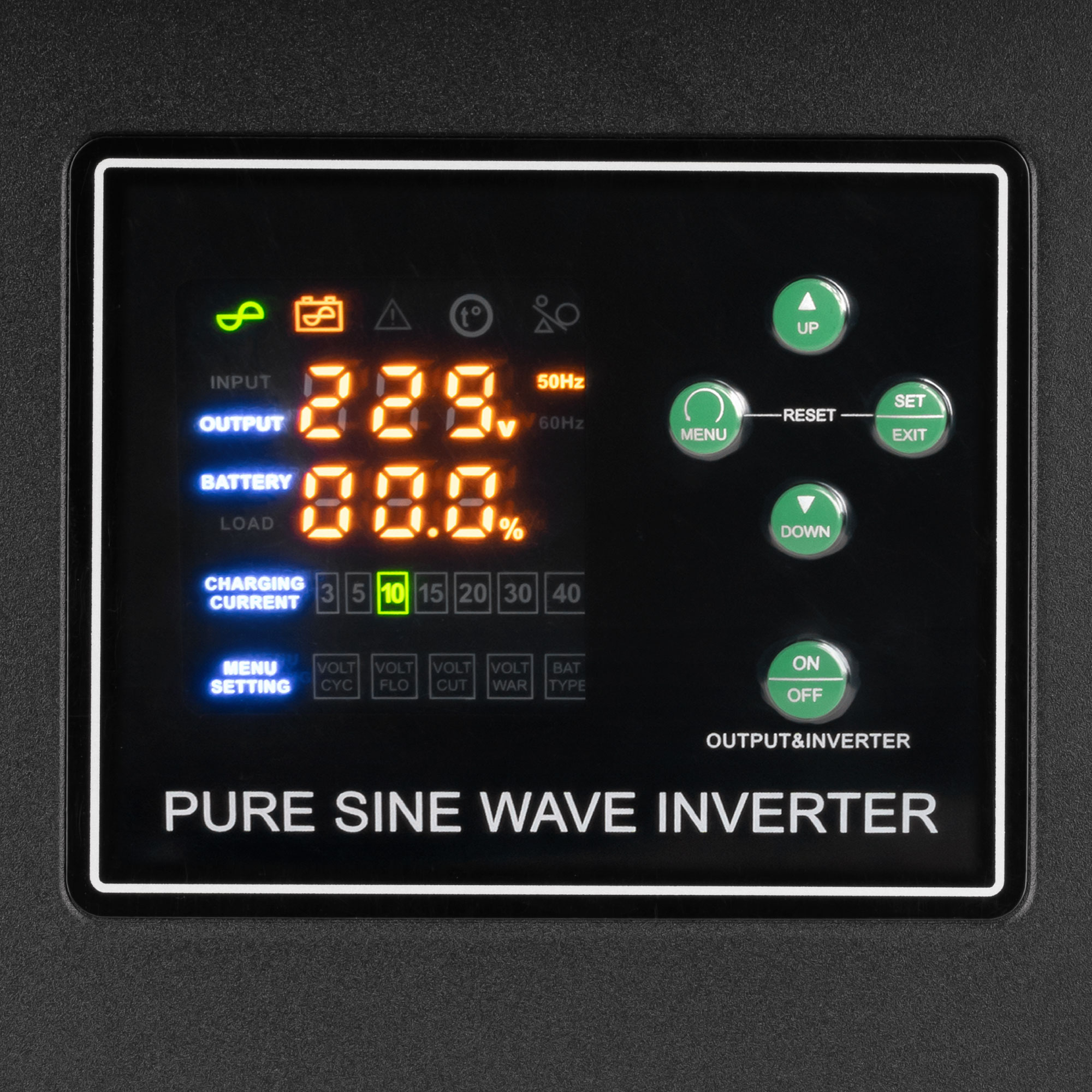 UPS-urile PRO Sinus de la KEMOT sunt echipate cu un afisaj LED clar care arata starea curenta de functionare a dispozitivului. Pe ecran puteti verifica, printre altele tensiunea de intrare, tensiunea de iesire si frecventa. Mai mult, puteti verifica rapid nivelul de incarcare la iesirea UPS-ului si nivelul de incarcare a bateriei.